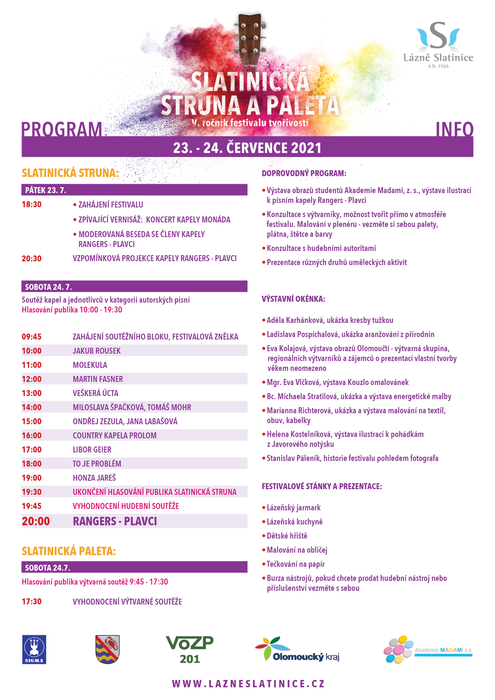 zveme na očekávanou událost s názvem Slatinická struna a paleta aneb V. ročník festivalu tvořivosti. Stejně jako v minulém roce, akce bude probíhat během dvou dní 23. - 24. 7. 2021