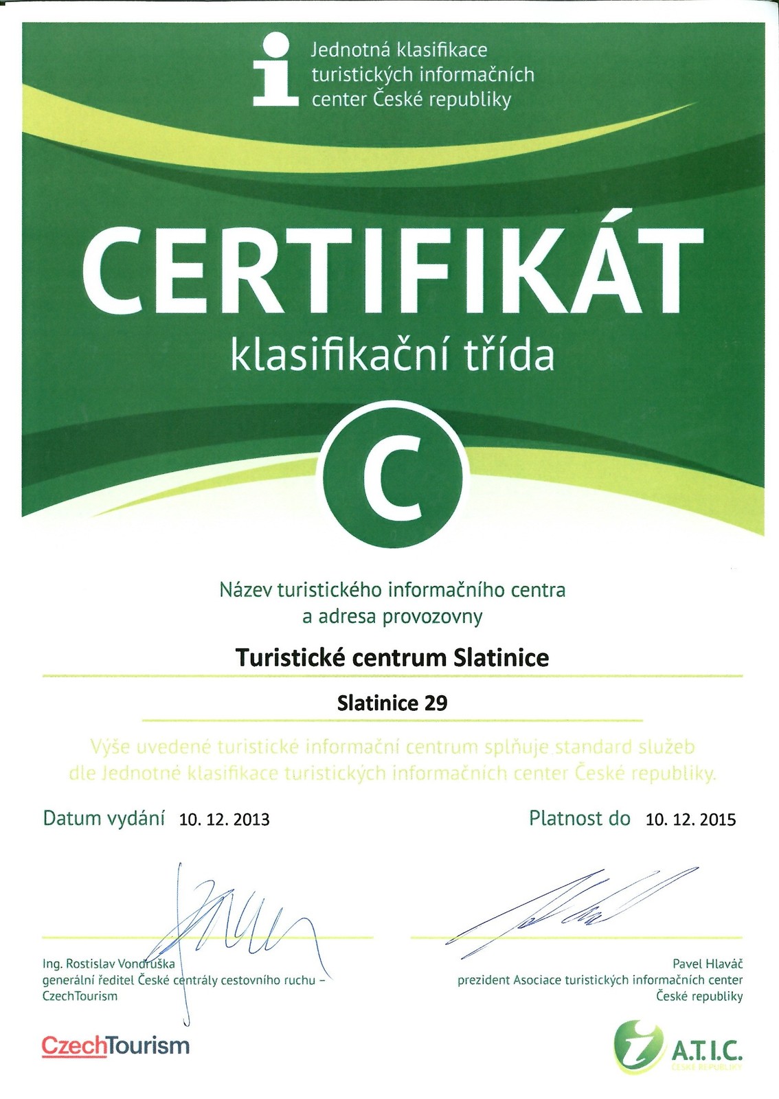 Turistické informační centrum Slatinice je držitelem certifikátu A.T.I.C. ČR